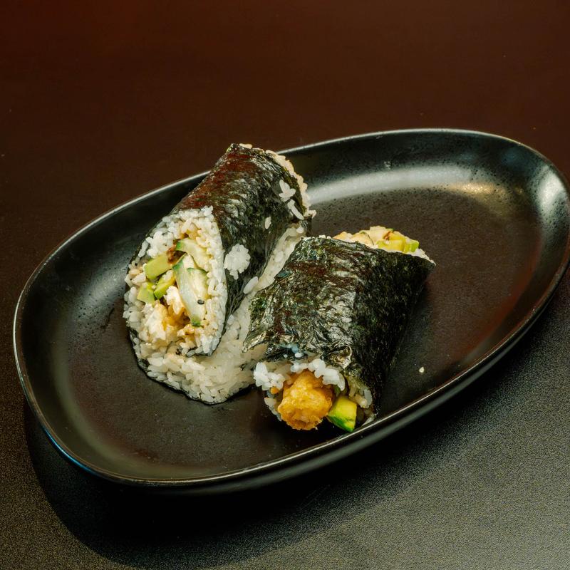 Premium seafood with hibachi fried rice, veggies, and house Yum Yum sauce in a soft tortilla
